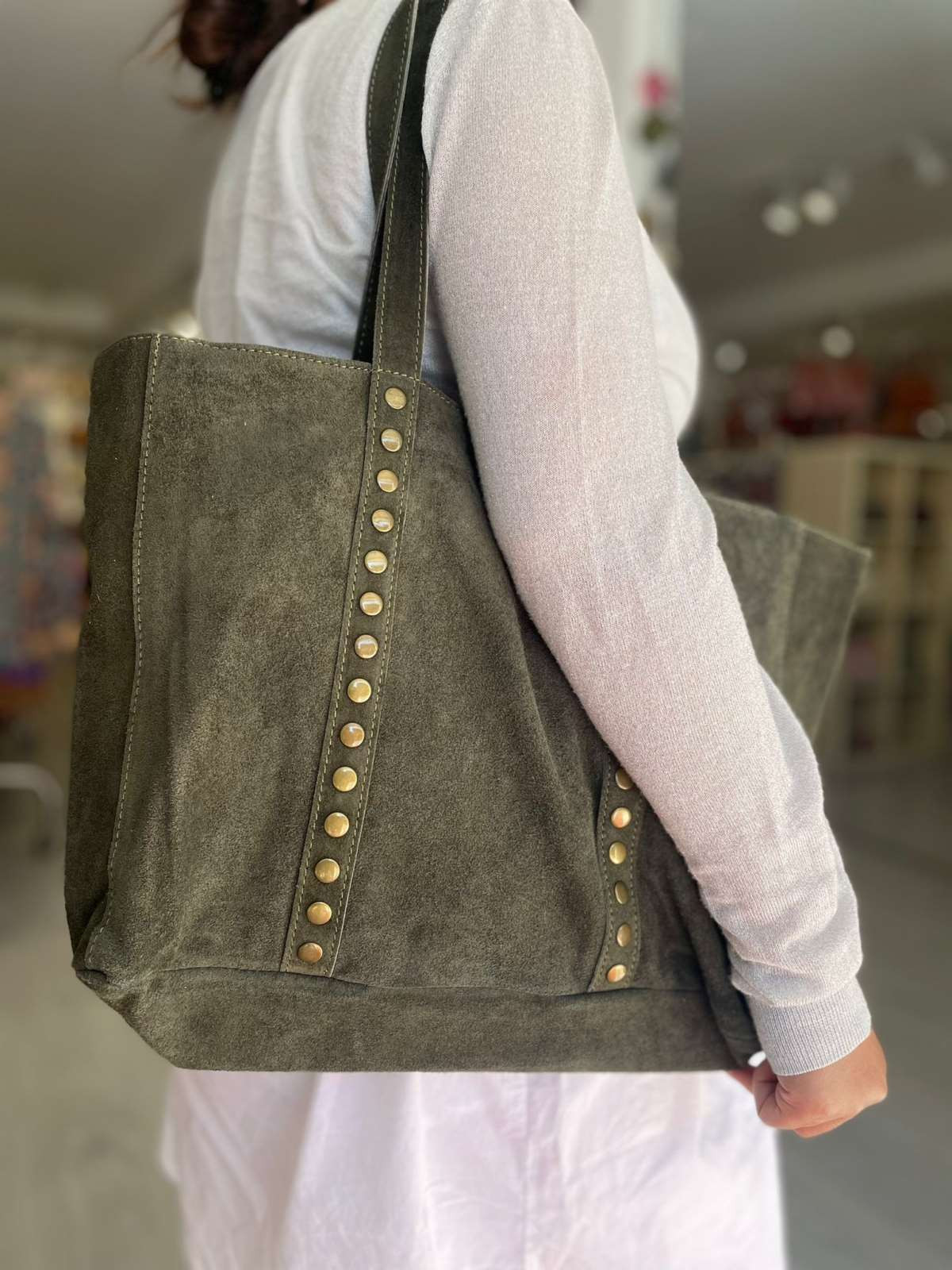 Bolso Shopper de Piel Serraje con Tachuelas y Asas Largas. B2B Llanes