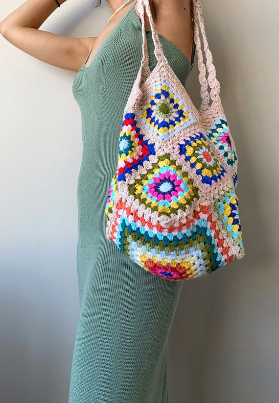 Bolso de ganchillo cuadrado de abuela hecho a mano, bolso tejido a mano, bolso de hombro tejido, accesorios de punto, bolso vintage, patrón de punto, look de blogger Y2K Etsy España