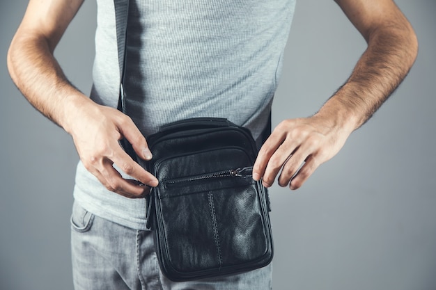 Bolso de mano de hombre con cremallera en la pared gris | Foto Premium
